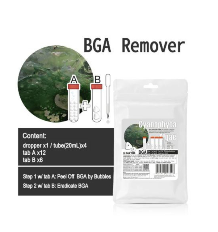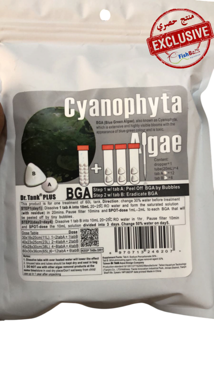الخطوة 1 (اليوم 1): قم بإذابة 1 تاب A في 10 مل من ماء RO بدرجة حرارة 20-25 درجة مئوية وتشكيل محلول مشبع (مع بقايا) في 20 دقيقة. قم بإيقاف الفلتر لمدة 10 دقائق وجرّع 1-2 مل من المحلول لكل منطقة طحالب زرقاء سيتم إزالتها بواسطة الفقاعات الصغيرة.