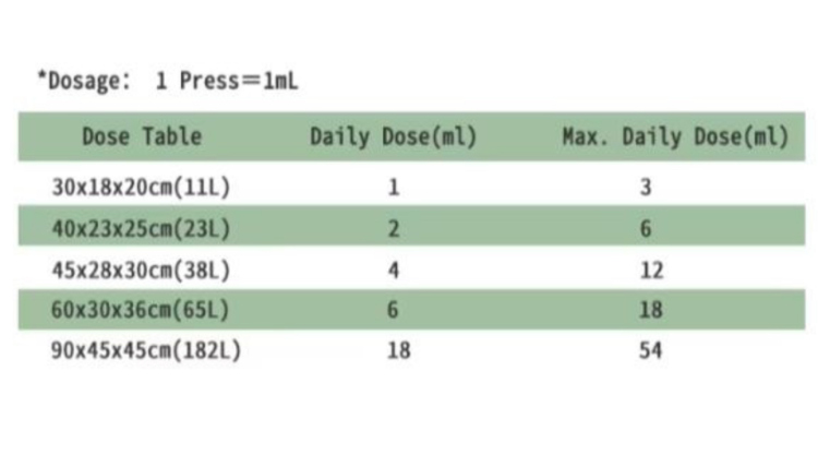 - حوض 23 لتر: 2 مل (الحد الأقصى: 6 مل)