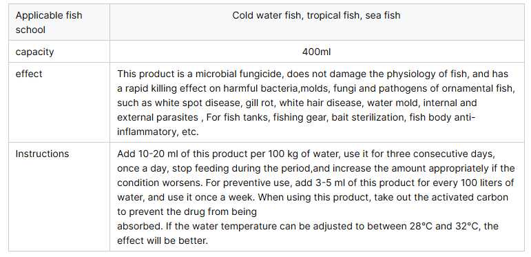 - له تأثير قتل سريع للبكتيريا الضارة والعفن والفطريات ومسببات أمراض أسماك الزينة، مثل مرض البقع البيضاء، تعفن الخياشيم، مرض الشعر الأبيض، العفن المائي، الطفيليات الداخلية والخارجية لأحواض الأسماك وأدوات العناية بالحوض