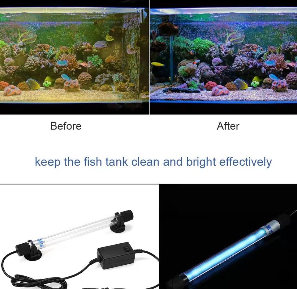 - لأن الأشعة فوق البنفسجية ضارة لعيون الأسماك والكائنات المائية ، يجب عدم وضع هذه اللمبة داخل الماء بدون غطاء عازل ..