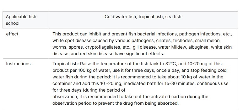 - هذا المنتج يمكنه أن يمنع ويعالج الالتهابات البكتيرية للأسماك، والاتهابات الجلدية ومرض البقع البيضاء الناجم عن مسببات الأمراض المختلفة، والأهداب، والتريكودات، وديدان البطيخ الصغيرة، والجراثيم، والسوطيات الخفية، وغيرها