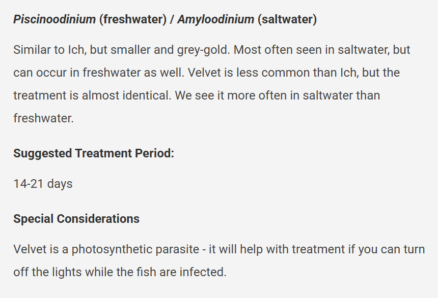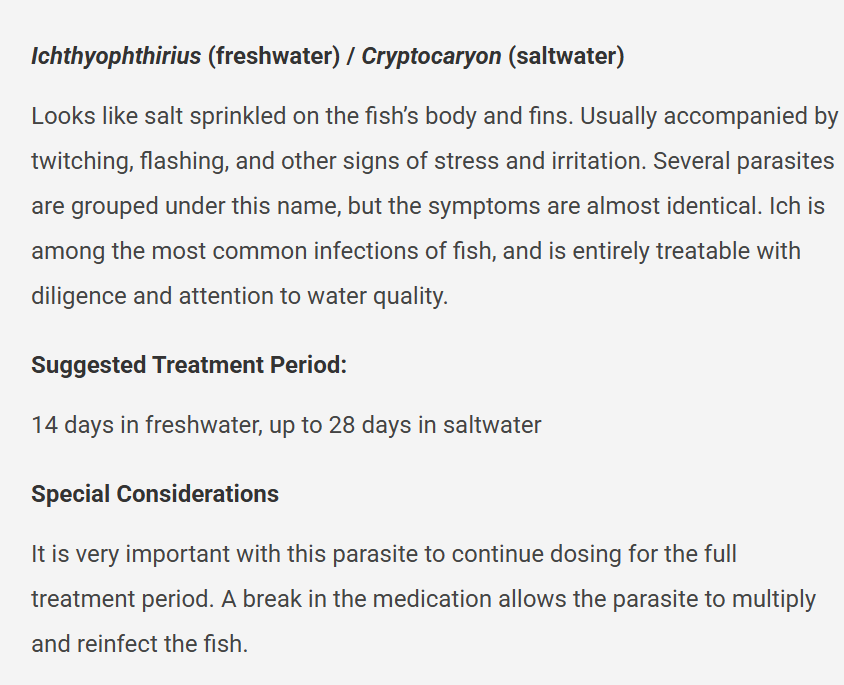 - يعالج بفعالية الطفيليات الخارجية مثل مرض النقط البيضاء، والفطريات، والبكتيريا، والفيروسات المسببة للأمراض الجلدية.
