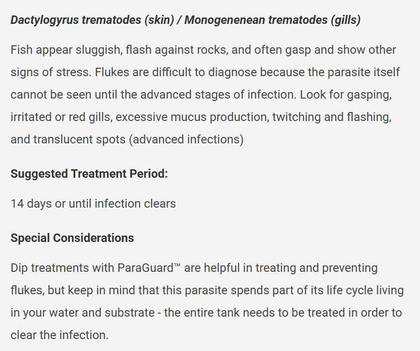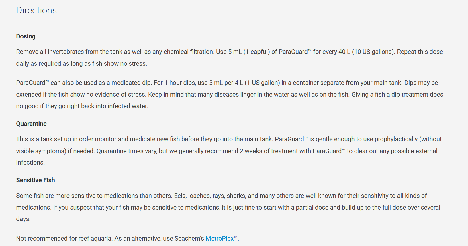 - أضف 5 مل من ParaGuard لكل 50 لتر من الماء مرة يوميًا طالما لم تظهر علامات إجهاد على الأسماك.