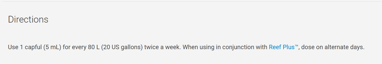 استعمل مقدار الغطاء - 5 ملل- لكل 80 لتر من الماء مرتين أسبوعياً .. وعند الاستخدام مع Reef Plus استخدم جرعتين أسبوعياً بالتوازي
